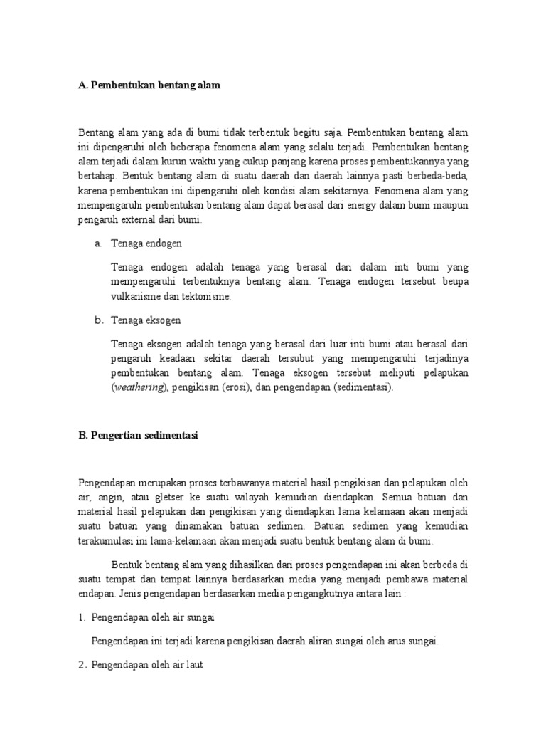 Tenaga Eksogen Sedimentasi Guru Geografi Man 1 Gunungkidul Diy from andimanwno.files.wordpress.com Tenaga eksogen merupakan tenaga yang berasal dari luar bumi. Tenaga eksogen bisa berasal dari tenaga angin, air, sinar matahari, gletser, dan organisme yang akan menyebabkan proses pelapukan, erosi. Tenaga eksogen adalah tenaga yang berasal dari luar bumi dan bersifat merusak. Sifatnya merusak atau merombak permukaan bumi yang sudah terbentuk oleh tenaga endogen. Perombakan muka bumi akibat tenaga eksogen dapat disebabkan oleh proses pelapukan, pengikisan, pengendapan, dan pergerakan batuan atau tanah. Sifat umum tenaga eksogen adalah merombak bentuk permukaan bumi hasil bentukan dari tenaga endogen. Pengertian tenaga endogen dan eksogen tenaga endogen adalah tenaga yang berasal dari dalam bumi yang menyebabkan perubahan pada kulit bumi. Tenaga eksogen adalah tenaga yang berasal dan luar bumi, antara lain berasal dan hujan, panas matahari, angin, aliran air, dan luncuran gletser serta makhluk hidup.